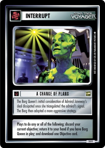 | Game Text (Errata) | Plays to do any or all of the following: discard your current objective; return it to your hand if you have Borg Queen in play; and download one Objective card. |