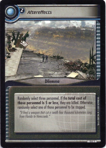 | Game Text | Randomly select three personnel. If the total cost of those personnel is 5 or less, they are killed. Otherwise, randomly select one of those personnel to be stopped. |