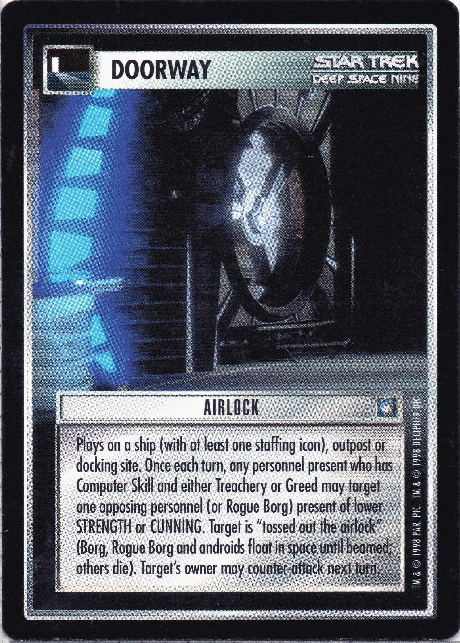| Game Text | Plays on a ship (with at least one staffing icon), outpost or docking site. Once each turn, any personnel present who has Computer Skill and either Treachery or Greed may target one opposing personnel (or Rogue Borg ) present of lower STRENGTH or CUNNING. Target is "tossed out the airlock" (Borg, Rogue Borg and androids float in space until beamed; others die). Target's owner may counter-attack next turn. |