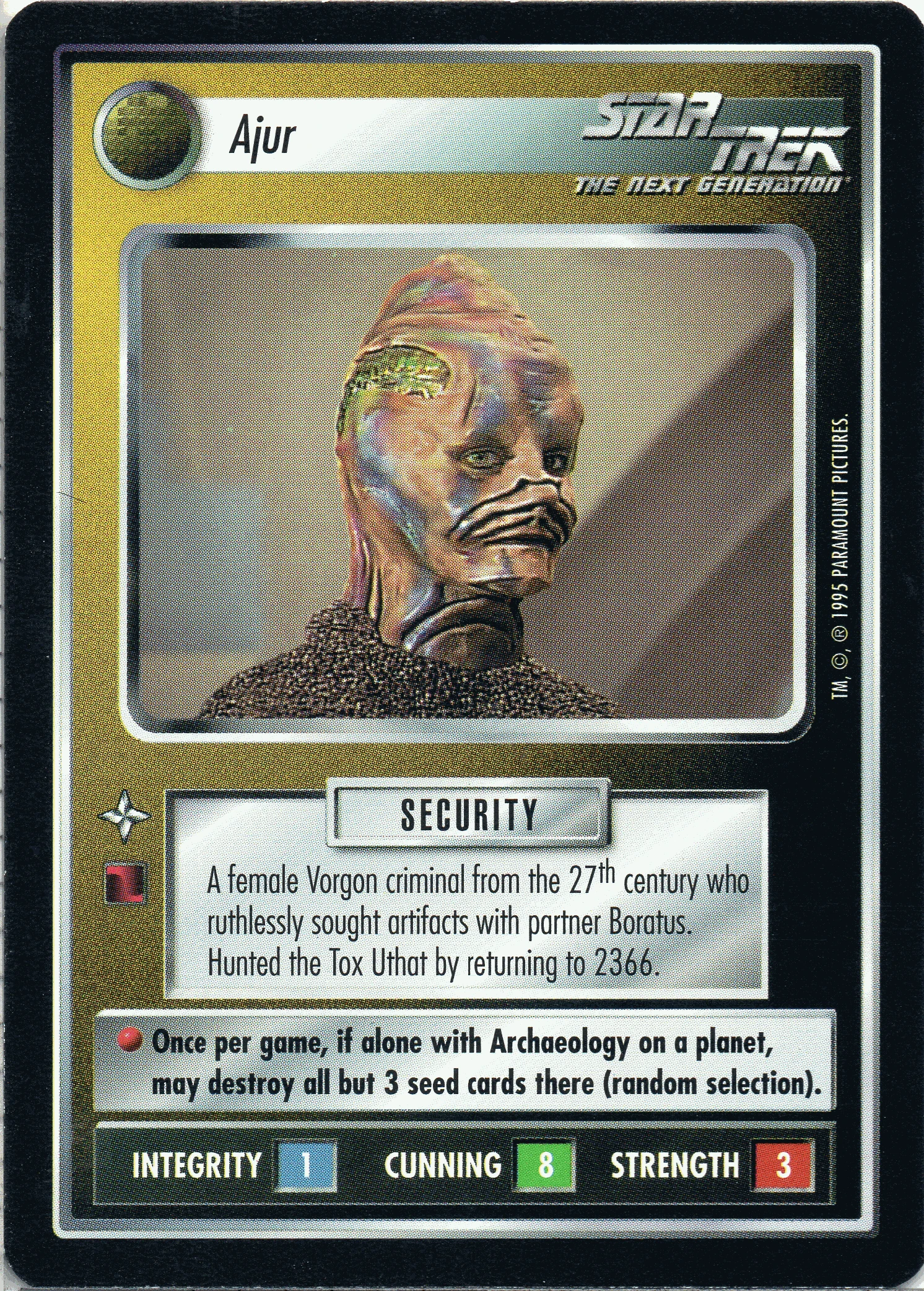| Lore (Errata 2) | A female Vorgon criminal from the 27th century who ruthlessly sough artifacts with partner Boratus. Hunted the Tox Uthat by returning to 2366. |
