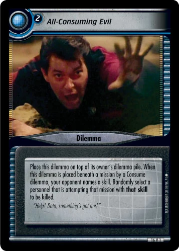 | Game Text | Place this dilemma on top of its owner's dilemma pile. When this dilemma is placed beneath a mission by a Consume dilemma, your opponent names a skill. Randomly select a personnel that is attempting that mission with that skill to be killed. |