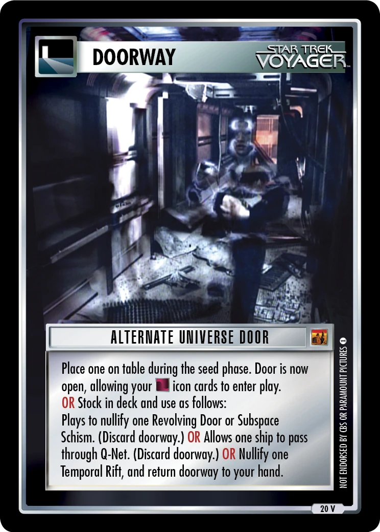 | Game Text | Place one on table during the seed phase. Door is now open, allowing your Plays to nullify one Revolving Door or Subspace Schism. (Discard doorway.) OR Allows one ship to pass through Q-Net. (Discard doorway.) OR Nullify one Temporal Rift, and return doorway to your hand. |