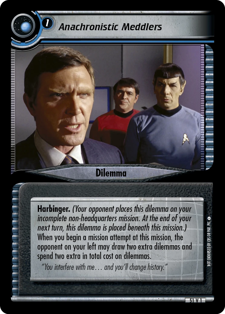 | Game Text | Harbinger. (Your opponent places this dilemma on your incomplete non-headquarters mission. At the end of your next turn, this dilemma is placed beneath this mission.) When you begin a mission attempt at this mission, the opponent on your left may draw two extra dilemmas and spend two extra in total cost on dilemmas. |