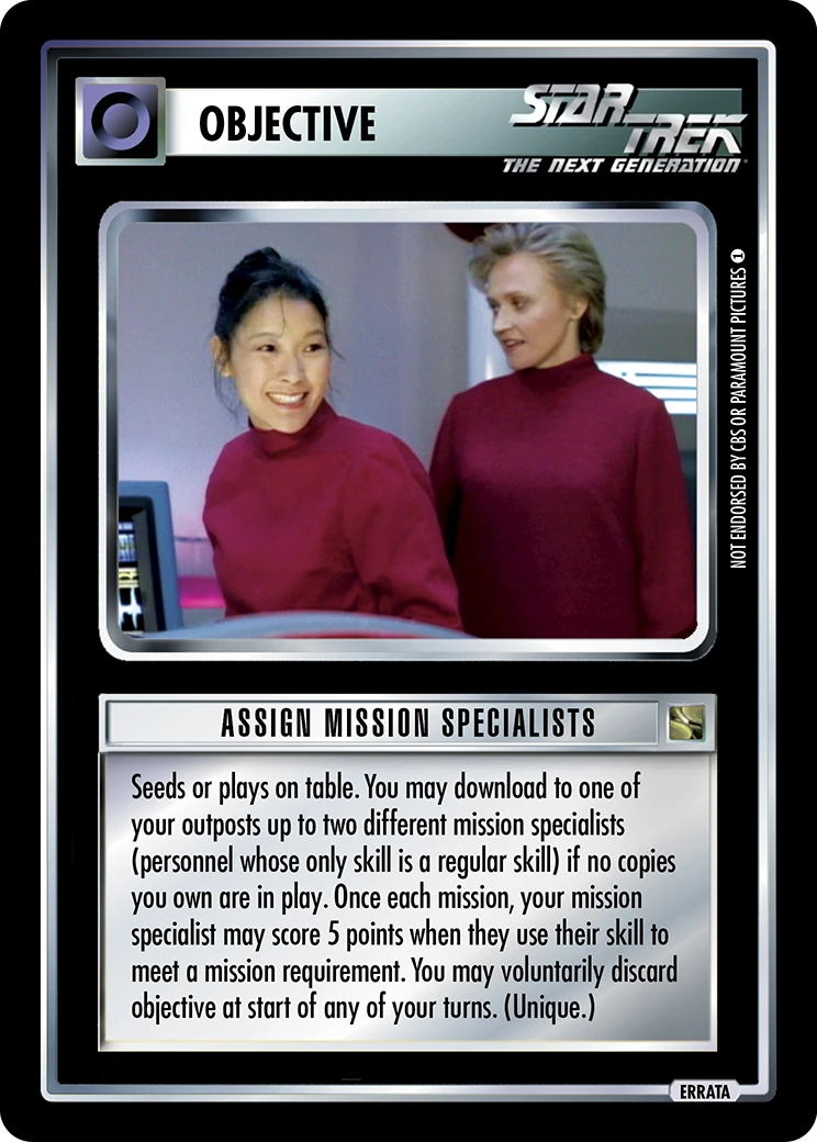 | Game Text | Seeds or plays on table. You may download to one of your outposts up to two different mission specialists (personnel whose only skill is a regular skill) if no copies you own are in play. Once each mission, your mission specialist may score 5 points when they use their skill to meet a mission requirement. You may voluntarily discard objective at start of any of your turns. (Unique.) |