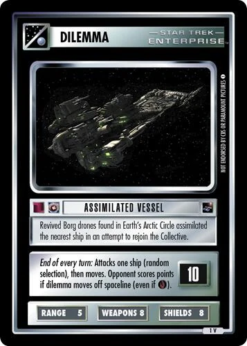 | Game Text | End of every turn: Attacks one ship (random selection), then moves. Opponent scores points if dilemma moves off spaceline (even if |