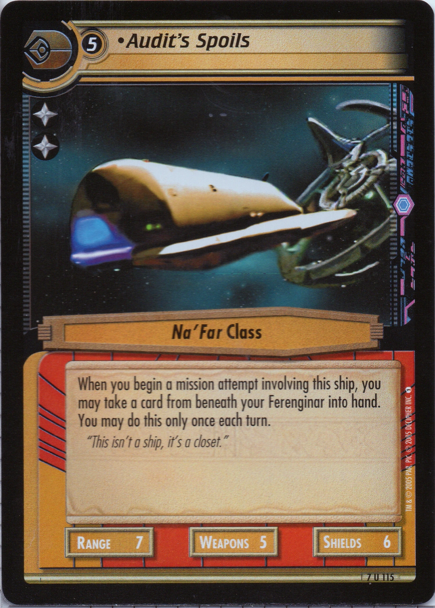 | Game Text | When you begin a mission attempt involving this ship, you may take a card from beneath your Ferenginar into hand. You may do this only once each turn. |