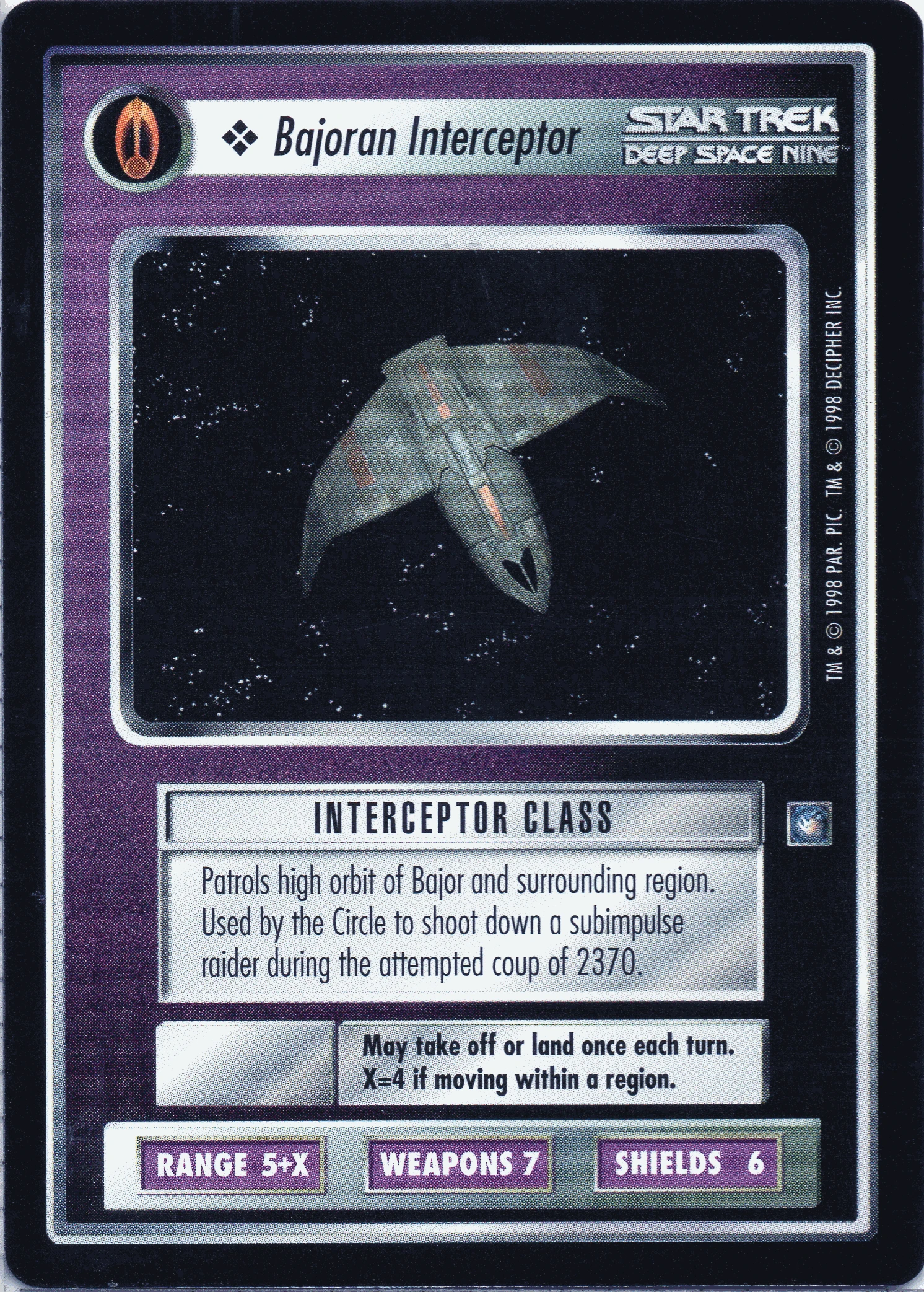 | Lore | Patrols high orbit of Bajor and surrounding region. Used by the Circle to shoot down a subimpulse raider during the attempted coup of 2370. |
