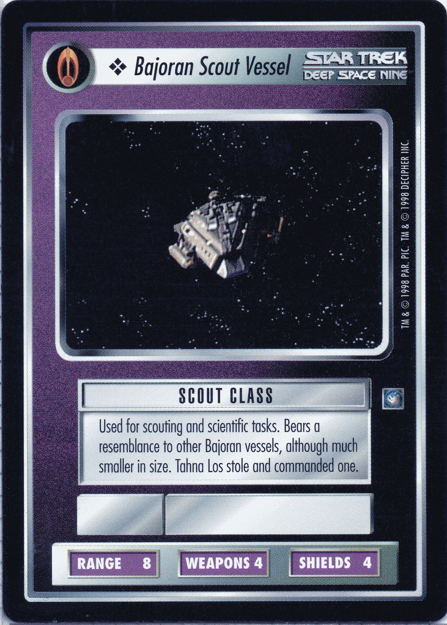 | Lore | Used for scouting and scientific tasks. Bears a resemblance to other Bajoran vessels, although much smaller in size. Tahna Los stole and commanded one. |