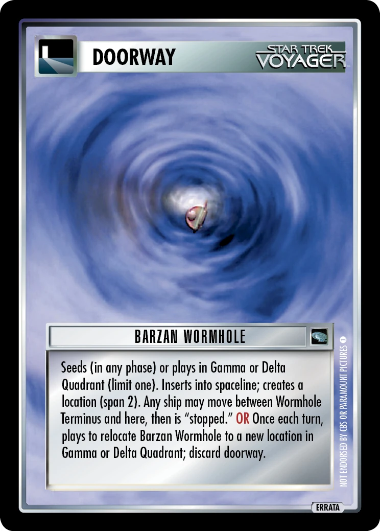 | Game Text | Seeds (in any phase) or plays in Gamma or Delta Quadrant (limit one). Inserts into spaceline; creates a location (span 2). Any ship may move between Wormhole Terminus and here, then is "stopped." OR Once each turn, plays to relocate Barzan Wormhole to a new location in Gamma or Delta Quadrant; discard doorway. |