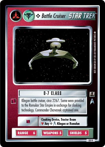 | Lore | Klingon battle cruiser, circa 2267. Some were provided to the Romulan Star Empire in exchange for cloaking technology. Commander Charvanek captained one. |