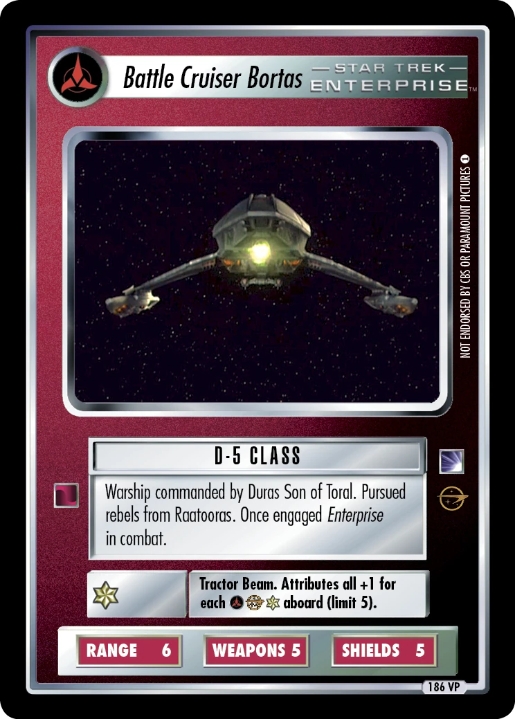 | Lore | Warship commanded by Duras Son of Toral. Pursued rebels from Raatooras. Once engaged Enterprise in combat. |