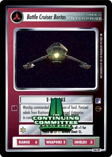 | Lore | Warship commanded by Duras Son of Toral. Pursued rebels from Raatooras. Once engaged Enterprise in combat. |