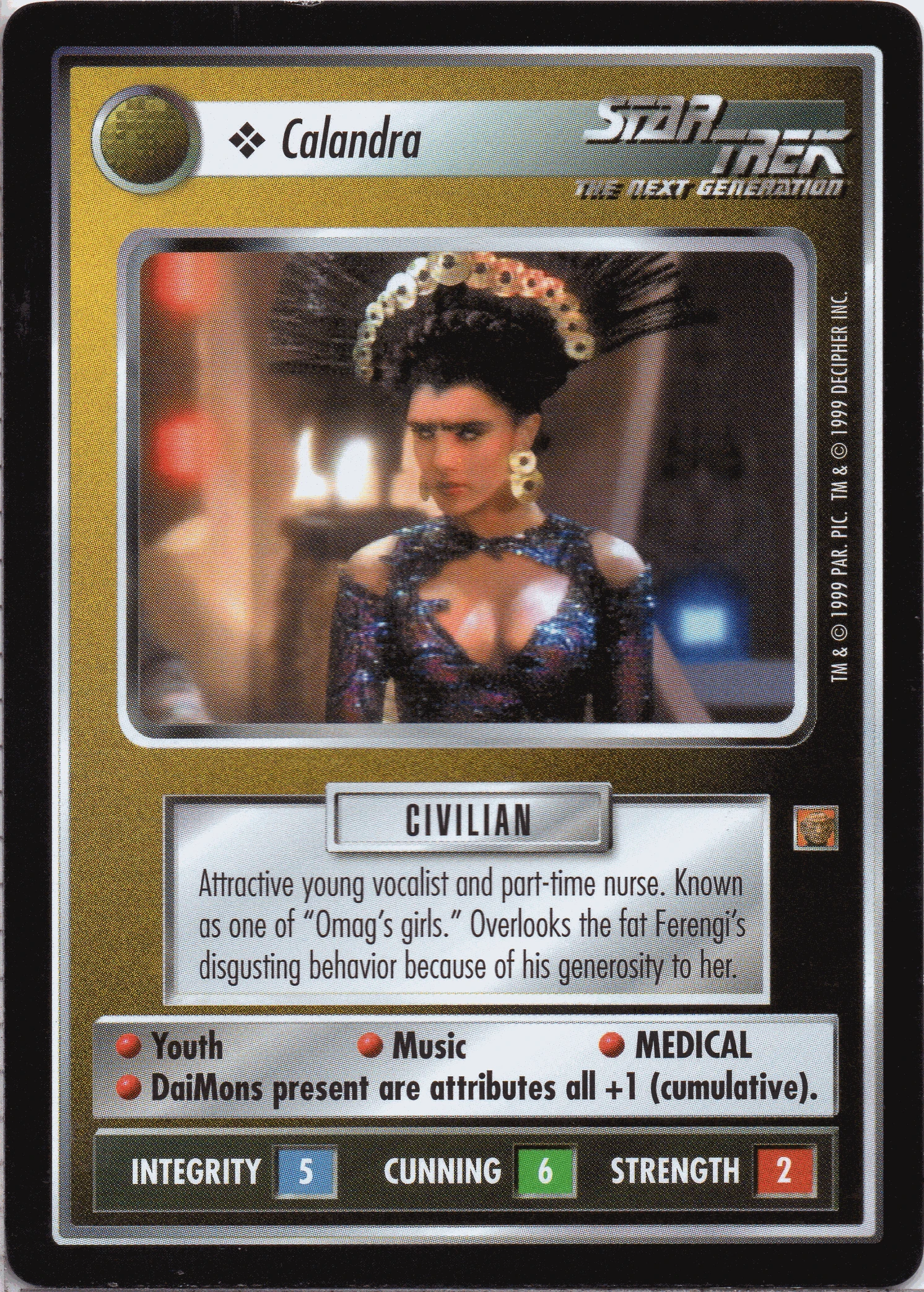 | Lore | Attractive young vocalist and part-time nurse. Known as one of "Omag's girls." Overlooks the fat Ferengi's disgusting behavior because of his generosity to her. |