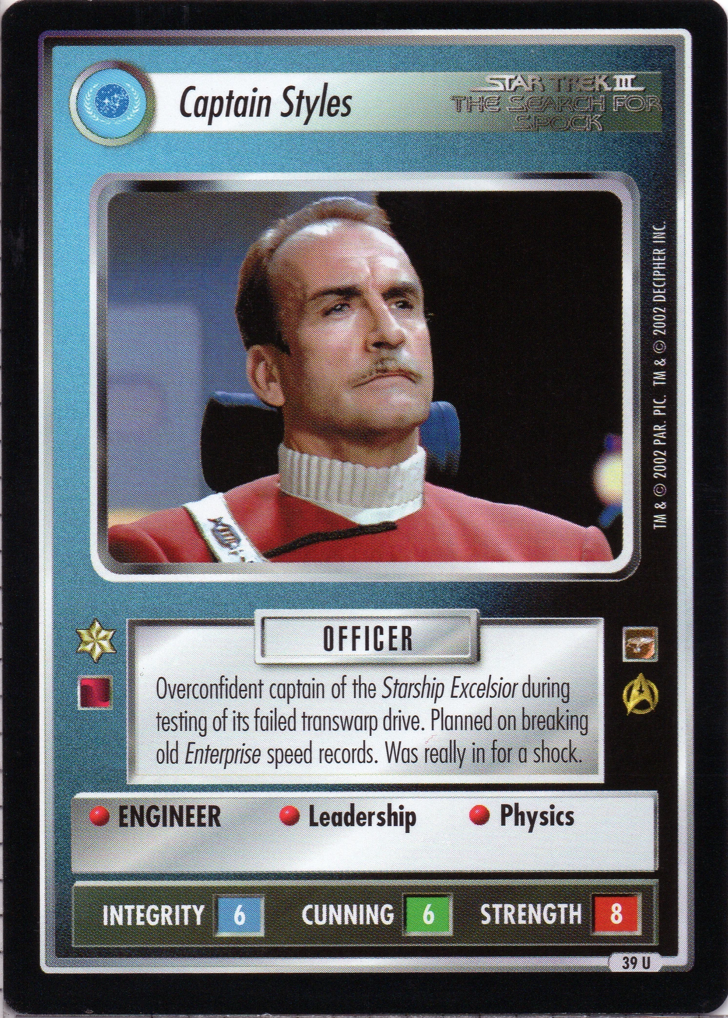 | Lore (Errata) | Overconfident captain of the Starship Excelsior during testing of its failed transwarp drive. Planned on breaking old Enterprise speed records. Was really in for a shock. |
