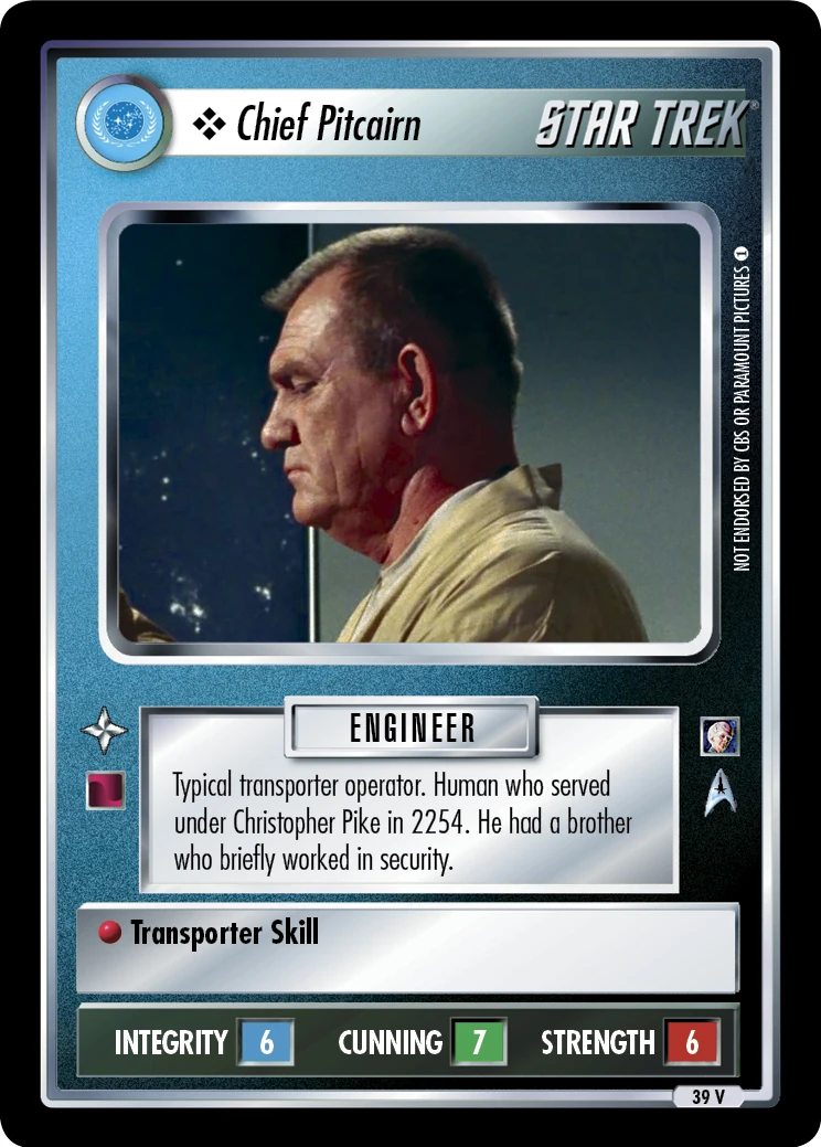 | Lore | Typical transporter operator. Human who served under Christopher Pike in 2254. He had a brother who briefly worked in security. |