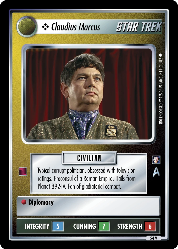 | Lore | Typical corrupt politician, obsessed with television ratings. Proconsul of a Roman Empire. Hails from Planet 892-IV. Fan of gladiatorial combat. |