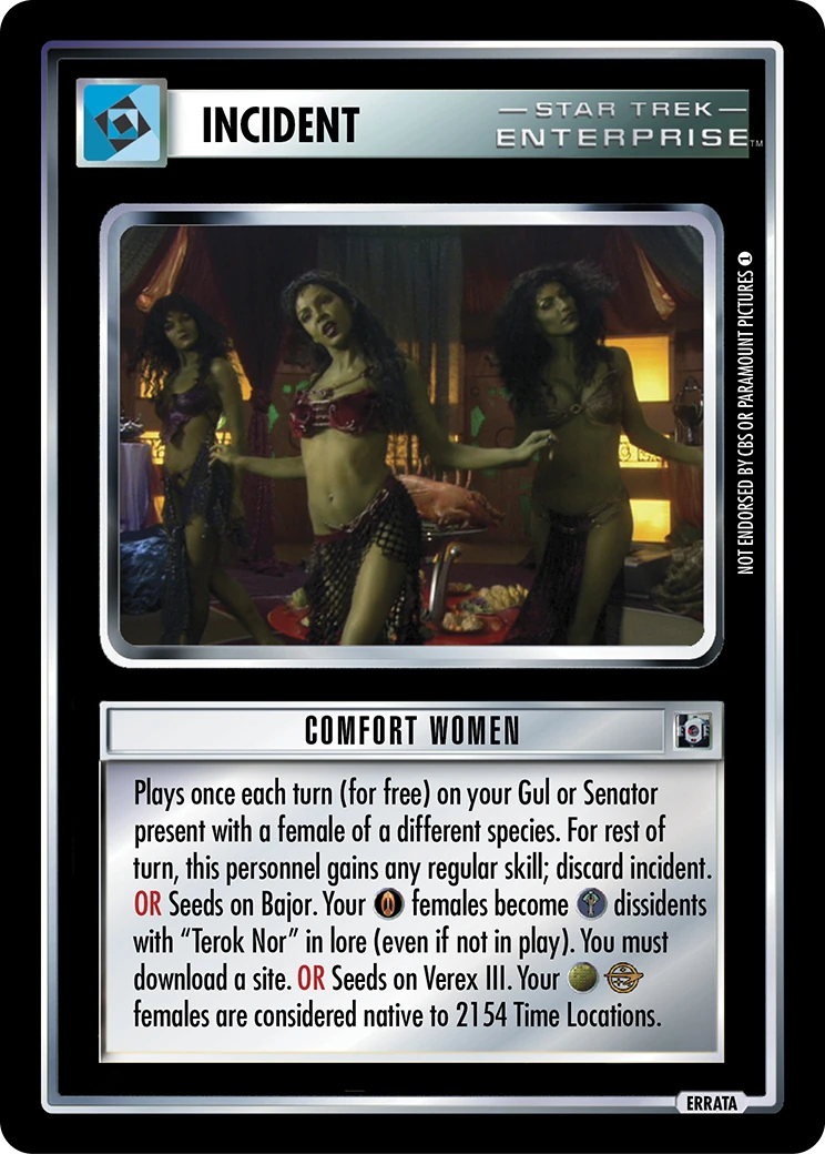 | Game Text | Plays once each turn (for free) on your Gul or Senator present with a female of a different species. For rest of turn, this personnel gains any regular skill; discard incident. OR Seeds on Bajor. Your |