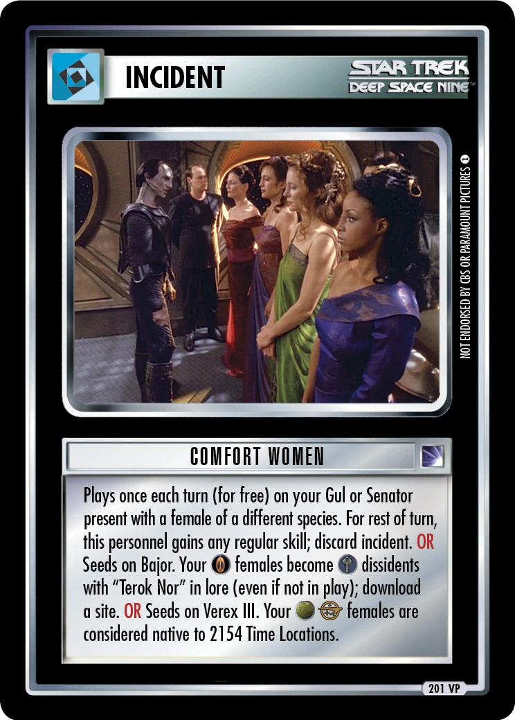 | Game Text (Errata) | Plays once each turn (for free) on your Gul or Senator present with a female of a different species. For rest of turn, this personnel gains any regular skill; discard incident. OR Seeds on Bajor. Your |