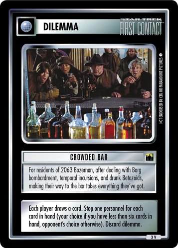 | Resolution Guide | Each player draws one card. Count the number of cards in your hand. If less than six, you choose that many personnel to be stopped (if possible). If six or more, your opponent chooses that many personnel to be "stopped" (if possible). After either result, discard dilemma; mission continues. |