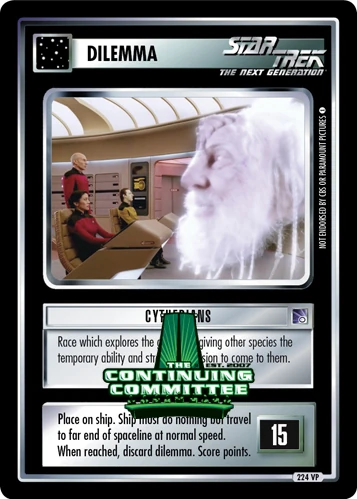 | Resolution Guide | Place on ship. Crew is not “stopped” and must begin travel immediately if staffed and RANGE remaining on ship. Place dilemma in bonus point area upon reaching end of spaceline. If ship is destroyed first, discard dilemma. (This is a “moving required action”; see “actions ??" required” in Glossary for rules. Borg must play out dilemma but do not score points.) |