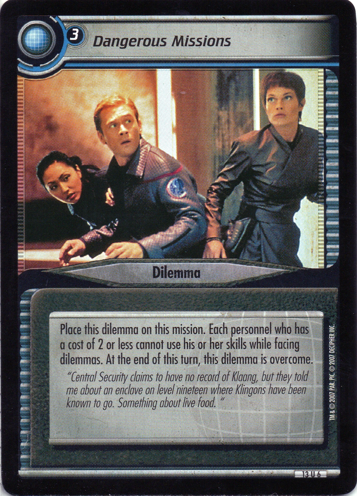 | Game Text | Place this dilemma on this mission. Each personnel who has a cost of 2 or less cannot use his or her skills while facing dilemmas. At the end of this turn, this dilemma is overcome. |