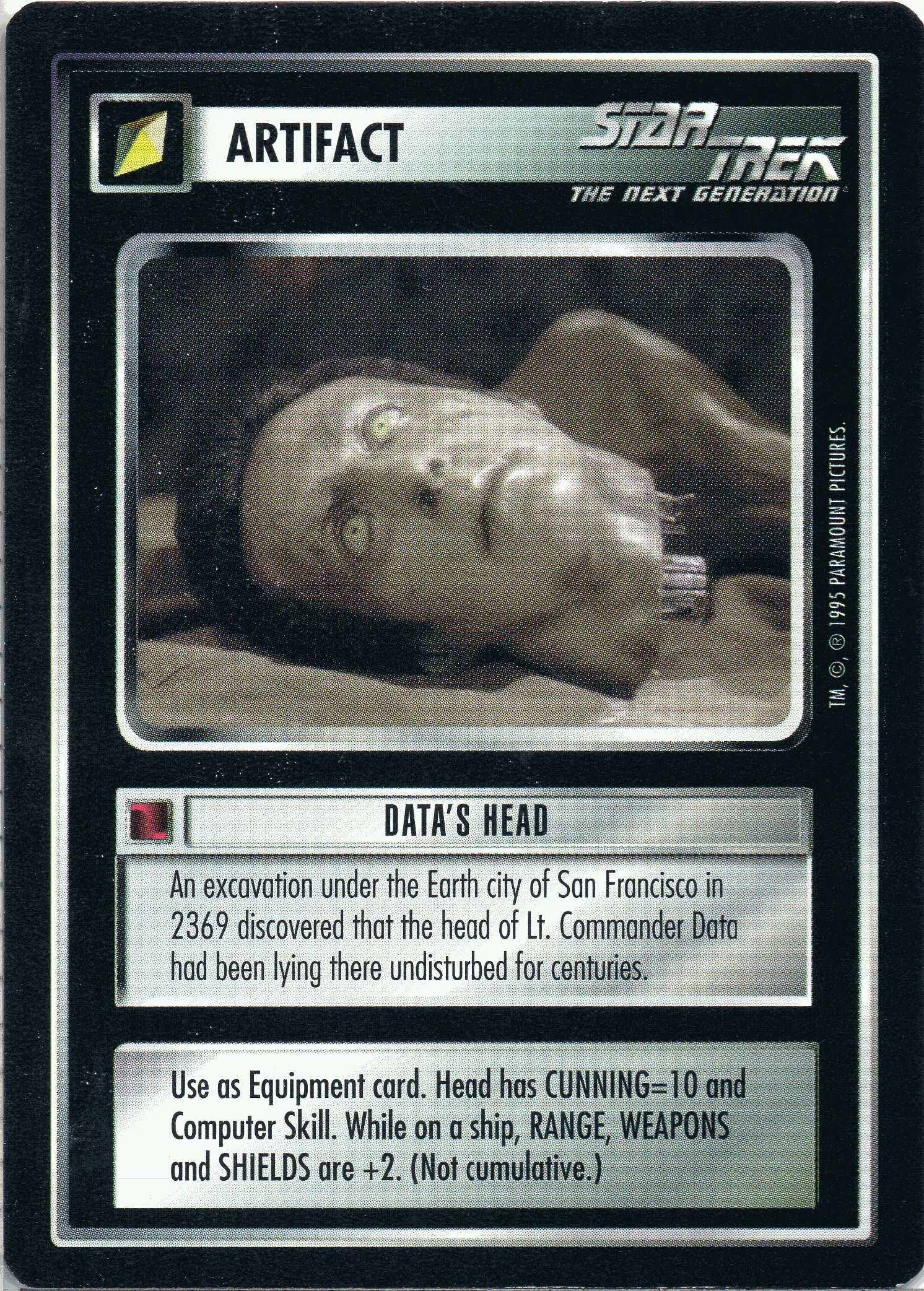 | Game Text | Use as Equipment card. Head has CUNNING=10 and Computer Skill. While on a ship, RANGE, WEAPONS and SHIELDS are +2. (Not cumulative.) |