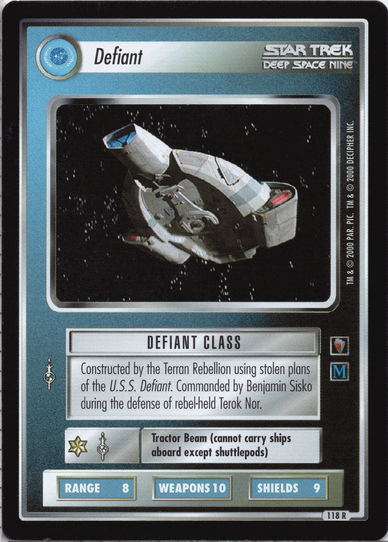 | Lore | Constructed by the Terran Rebellion using station plans of the U.S.S. Defiant. Commanded by Benjamin Sisko during the defense of rebel-hold Terok Nor. |