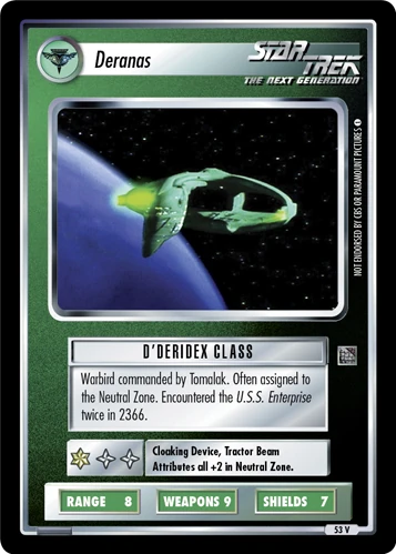 | Lore | Warbird commanded by Tomalak. Often assigned to the Neutral Zone. Encountered the U.S.S. Enterprise twice in 2366. |