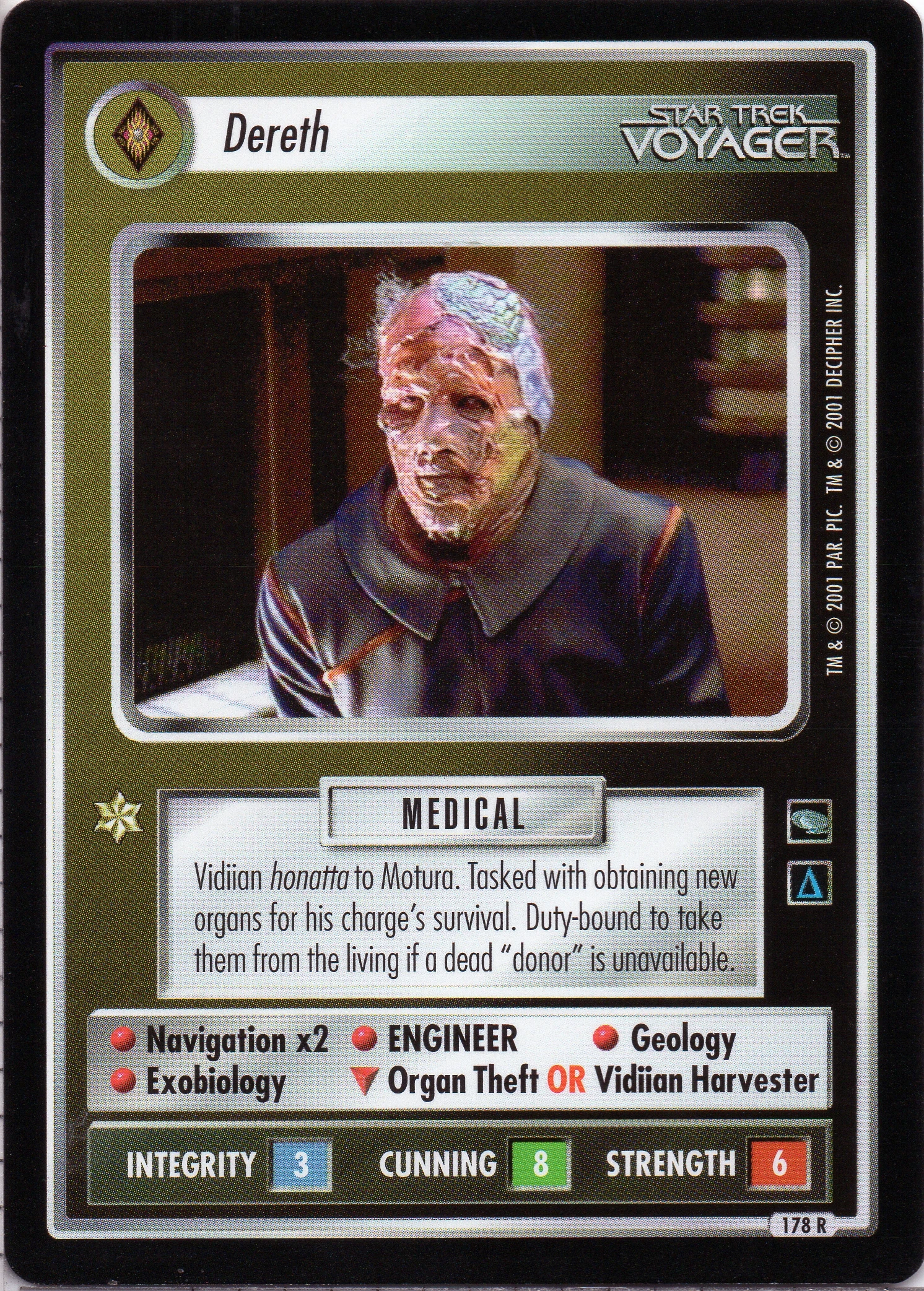 | Lore | Vidiian honatta to Motura. Tasked with obtaining new organs for his charge's survival. Duty-bound to take them from the living if a dead "donor" is unavailable. |