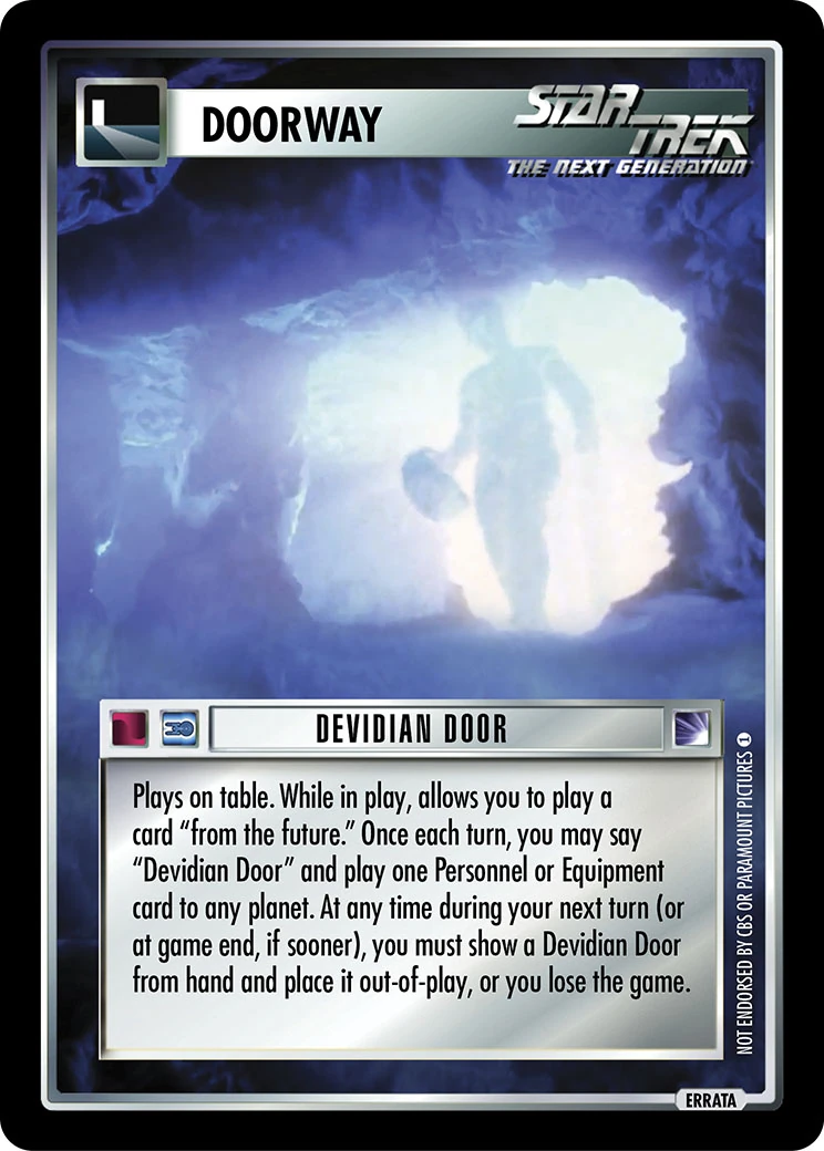 | Game Text | Plays on table. While in play, allows you to play a card "from the future." Once each turn, you may say "Devidian Door" and play one Personnel or Equipment card to any planet. At any time during your next turn (or at game end, if sooner), you must show a Devidian Door from hand and place it out-of-play, or you lose the game. |