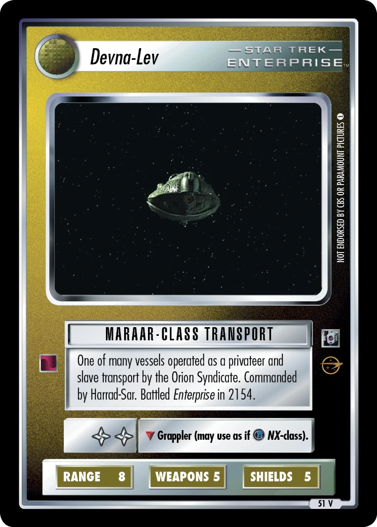 | Lore | One of many vessels operated as a privateer and slave transport by the Orion Syndicate. Commanded by Harrad-Sar. Battled Enterprise in 2154. |