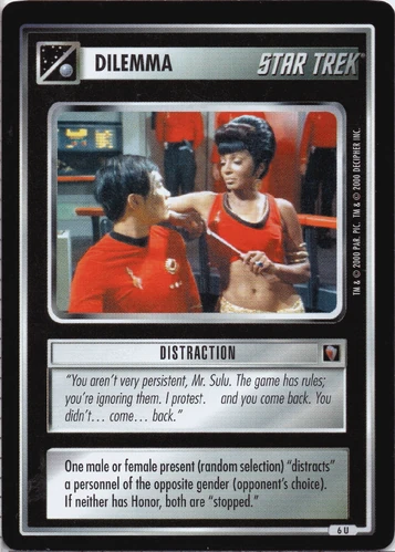| Resolution Guide | If playing Borg affiliation, discard gender-related dilemma immediately; scouting continues. If no target (at least one male AND one female) present, discard dilemma; mission continues. Otherwise, randomly select one Away Team/crew member from all males or females present (remove any genderless cards from selection pool). Opponent chooses one Away Team/crew member of opposite gender (if none present, discard dilemma; mission continues). If neither of the two personnel has Honor, both are stopped, otherwise they continue with remainder of Away Team/ship and crew, discard dilemma; mission continues. Note that is the first card randomly selected is a dual-personnel card, opponent may select someone of the opposite gender for BOTH personnel on the card. Example: Beverly and Will are randomly selected. Opponent may then select one male (for Beverly) and one female (for Will) and all four of the personnel are stopped. If any of the personnel your opponent selects has Honor (for example, Kahless for Beverley's partner), then that personnel is not stopped. However, if Will's partner does not have Honor, Will and his partner would be stopped, and Beverley would be stopped as well by virtue of the rule that "whatever happens to one personnel on a dual-personnel card also happens to the other". |