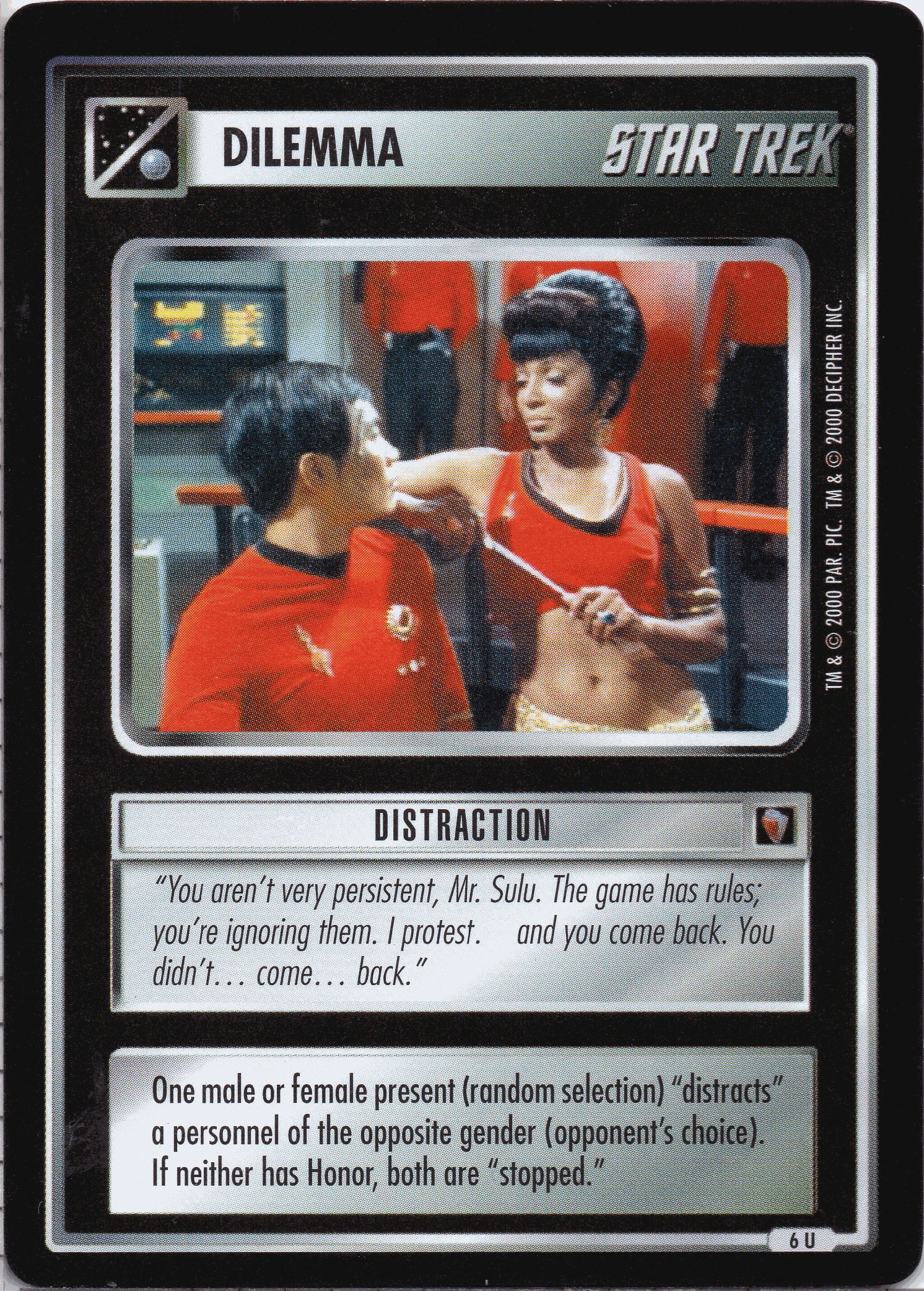 | Game Text | One male or female present (random selection) "distracts" a personnel of the opposite gender (opponent's choice). If neither has Honor, both are "stopped." |