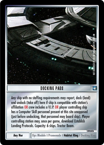 | Game Text | Any ship with no staffing requirements may report, dock (land) and undock (take off) here if ship is compatible with station's affiliation OR Crew includes a V.I.P. OR player controlling ship has a Computer Skill personnel present at this site unopposed (just before undocking, that personnel may board ship). Player controlling station may, once per game, download Establish Landing Protocols. |