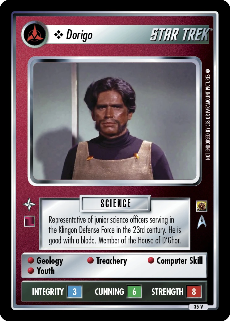 | Lore | Representative of junior science officers serving in the Klingon Defense Force in the 23rd century. He is good with a blade. Member of the House of D'Ghor. |