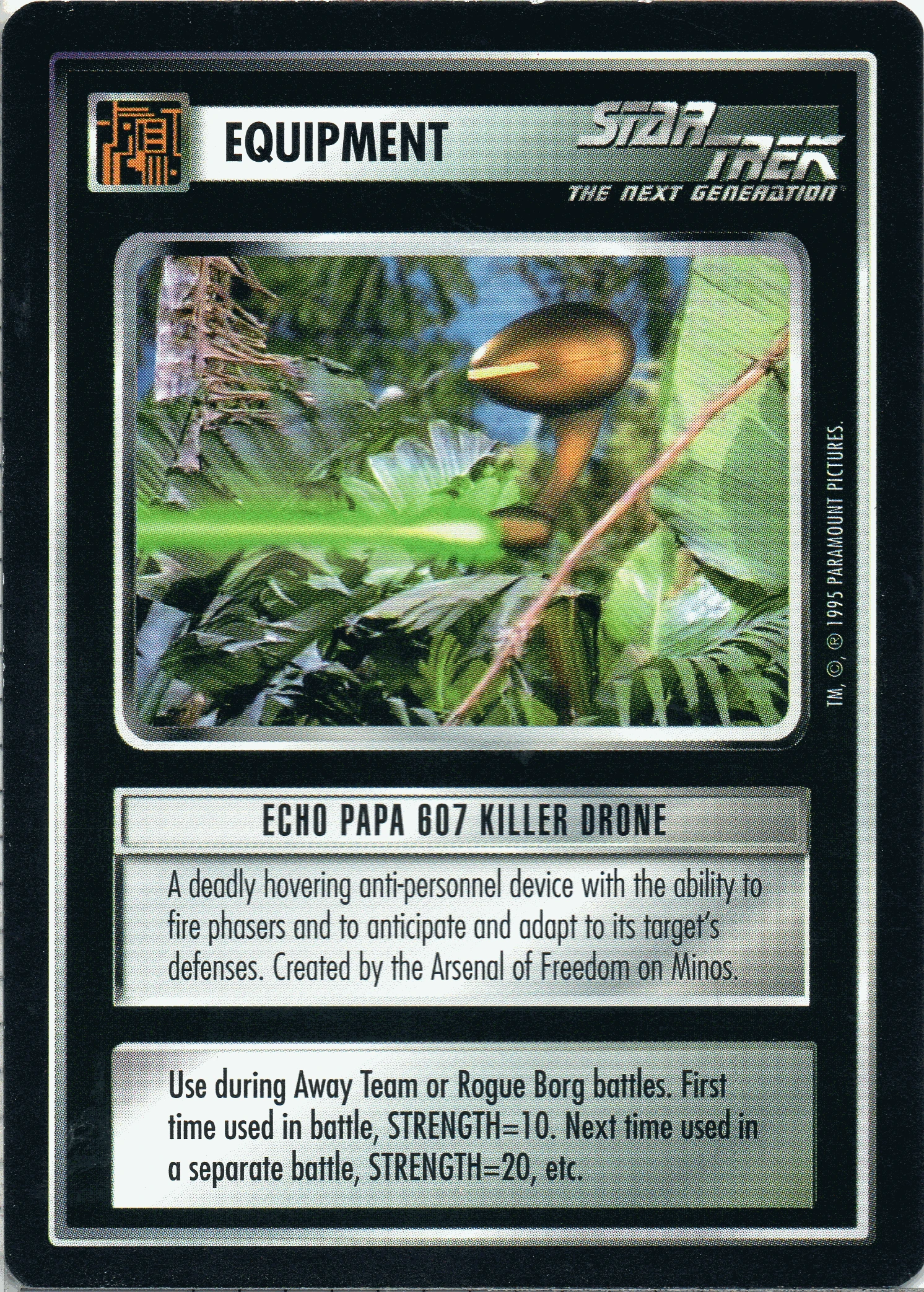 | Game Text | Use during Away Team or Rogue Borg battles. First time used in battle, STRENGTH=10. Next time used in a separate battle, STRENGTH=20 etc. |