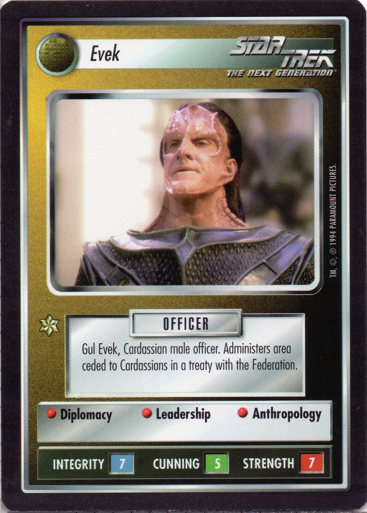 | Lore | Gul Evek, Cardassian male officer. Administers area ceded to Cardassians in a treaty with the Federation. |