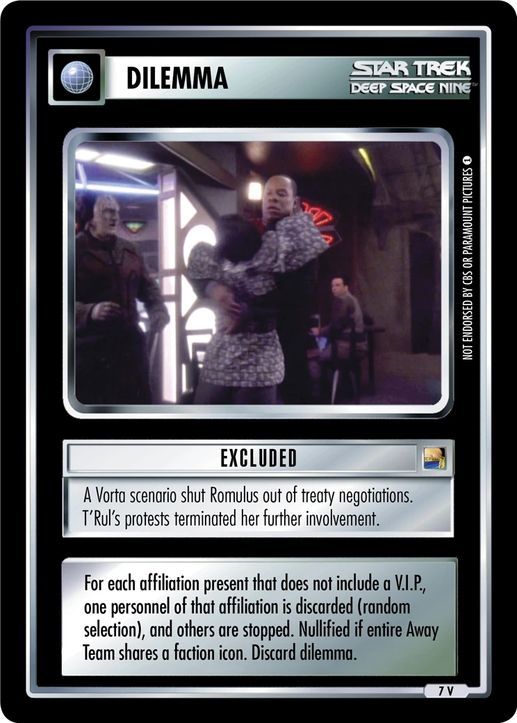 | Game Text | For each affiliation present that does not include a V.I.P., one personnel of that affiliation is discarded (random selection), and others are stopped. Nullified if entire Away Team shares a faction icon. Discard dilemma. |