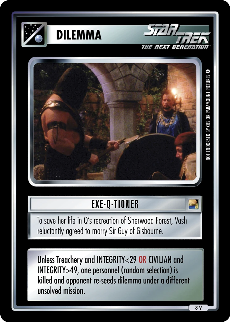 | Game Text | Unless Treachery and INTEGRITY<29 OR CIVILIAN and INTEGRITY>49, one personnel (random selection) is killed and opponent re-seeds dilemma under a different unsolved mission. |