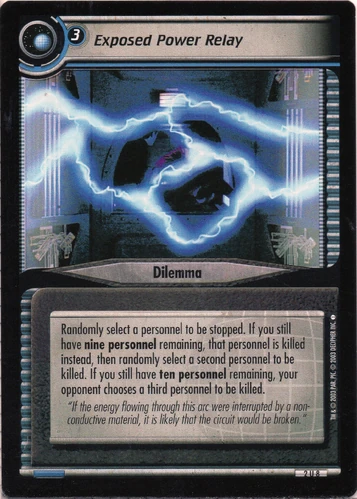 | Game Text | Randomly select a personnel to be stopped. If you still have nine personnel remaining, that personnel is killed instead, then randomly select a second personnel to be killed. If you still have ten personnel remaining, your opponent chooses a third personnel to be killed. |