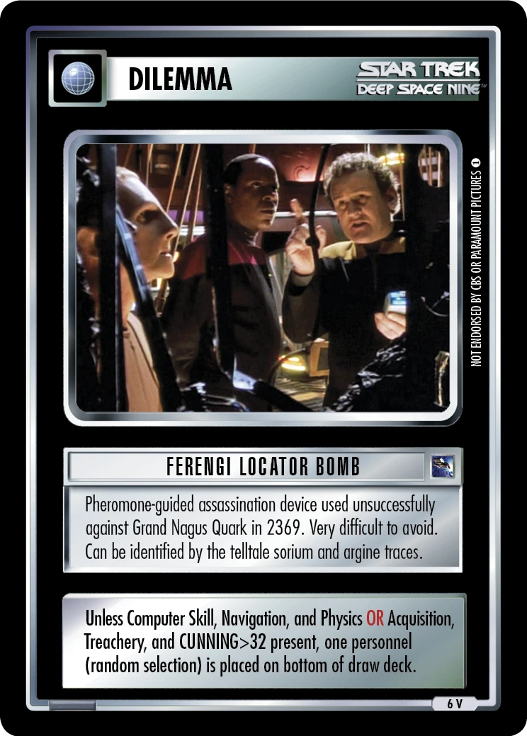 | Game Text | Unless Computer Skill, Navigation, and Physics OR Acquisition, Treachery, and CUNNING>32 present, one personnel (random selection) is placed on bottom of draw deck. |