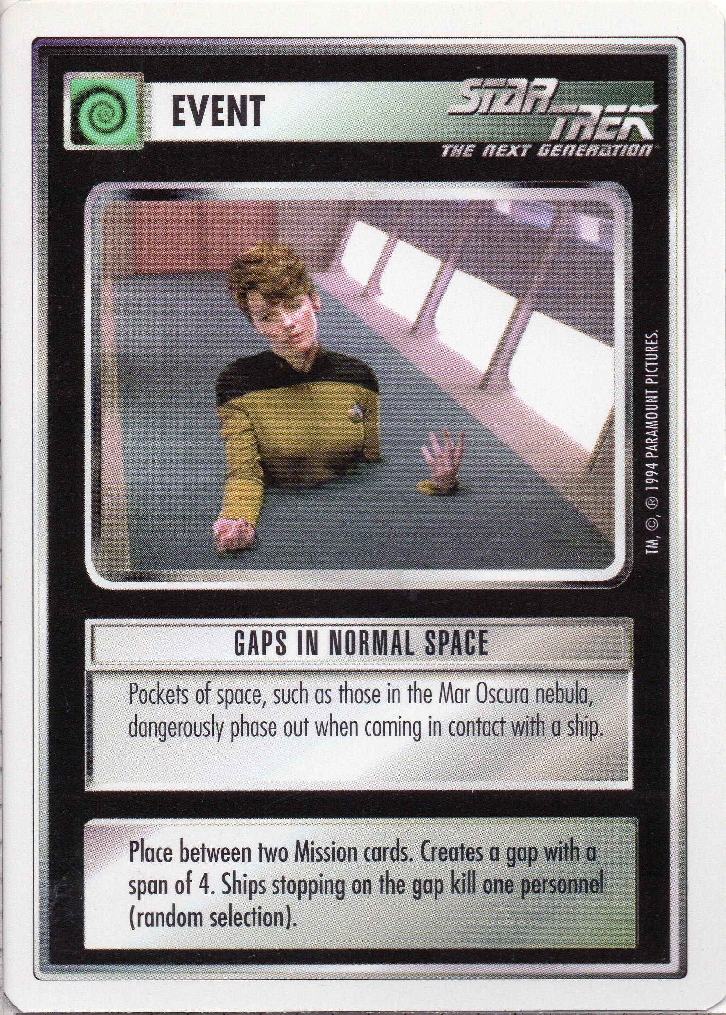 | Game Text | Place between two Mission cards. Creates a gap with a span of 4. Ships stopping on the gap kill one personnel (random selection). |