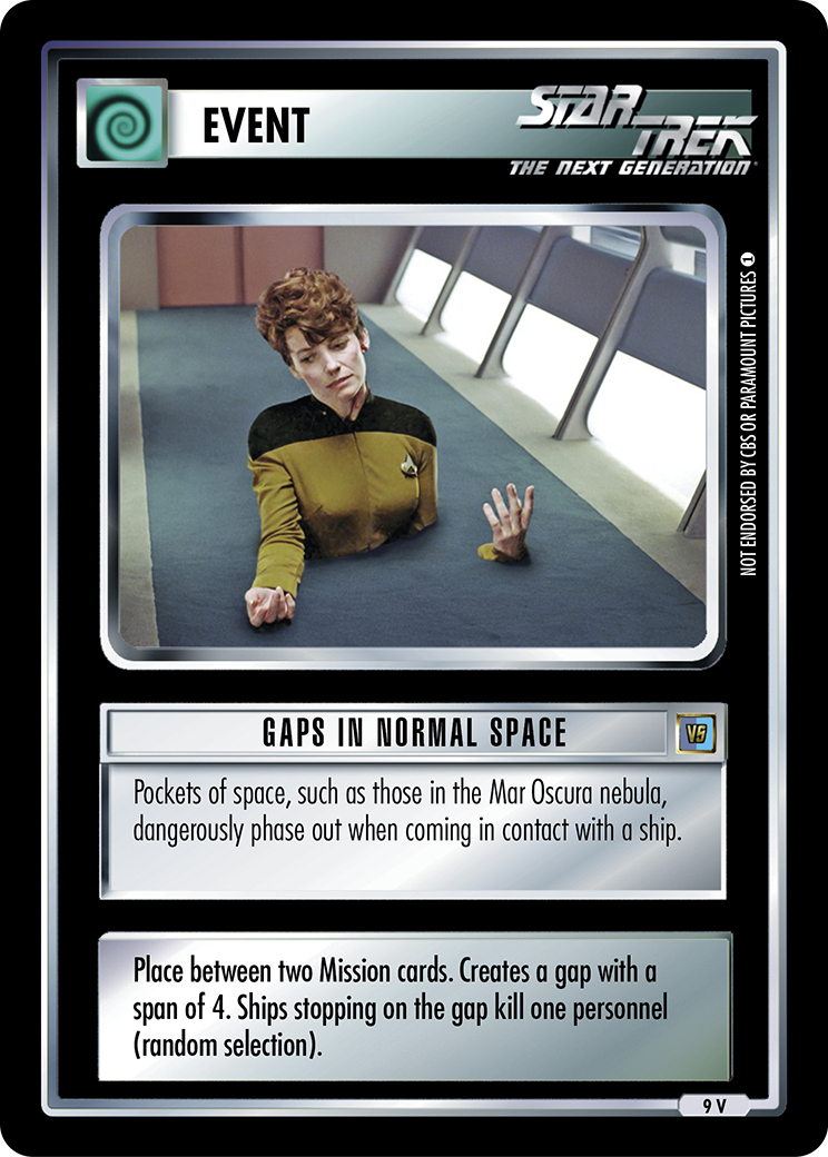 | Game Text | Place between two Mission cards. Creates a gap with a span of 4. Ships stopping on the gap kill one personnel (random selection). |