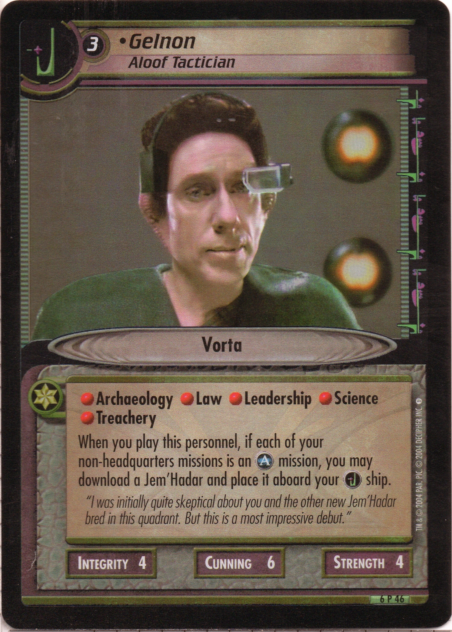 | Lore | "I was initially quite skeptical about you and the other new Jem'Hadar bred in this quadrant. But this is a most impressive debut." |