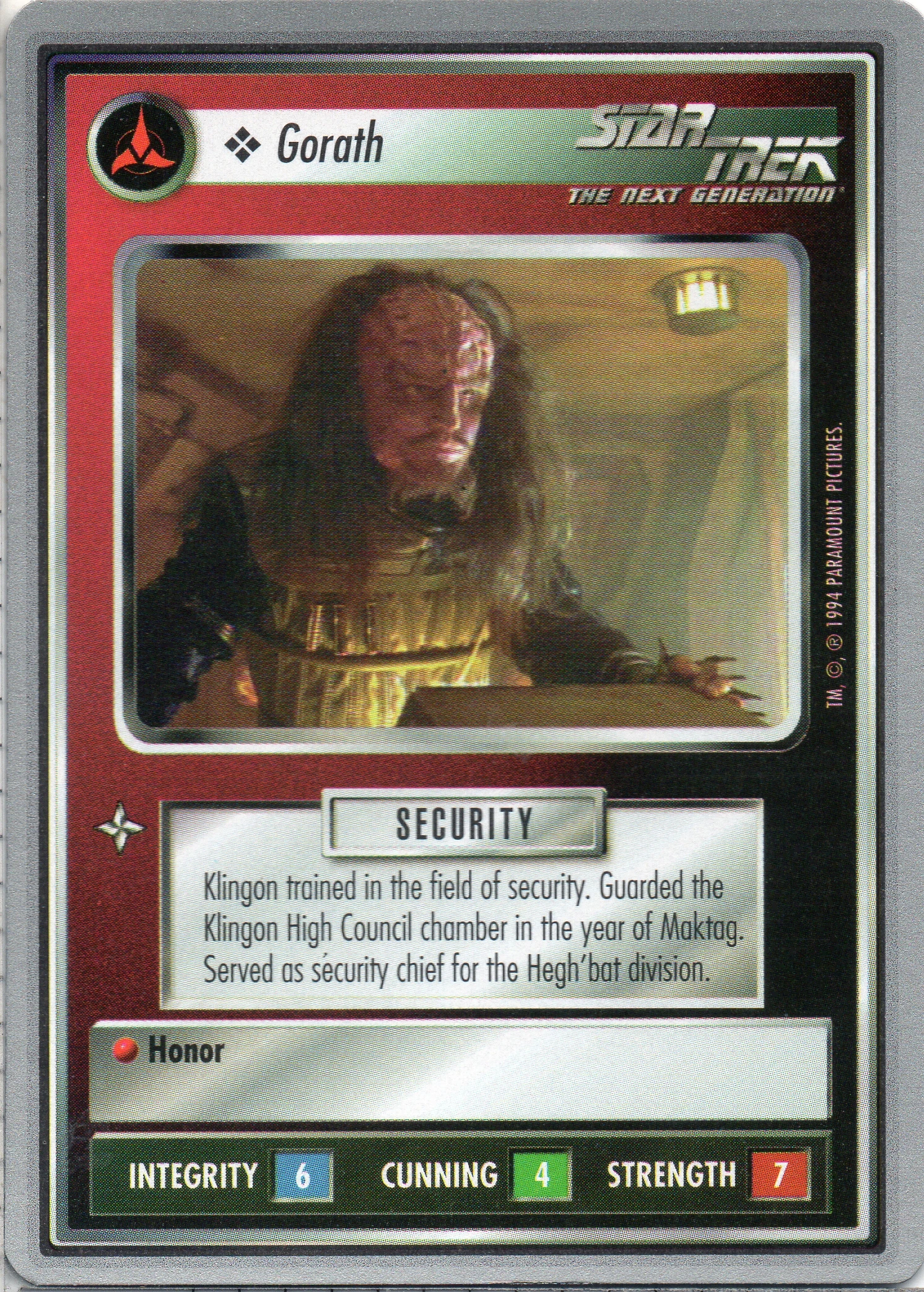 | Lore | Klingon trained in the field of security. Guarded the Klingon High Council chamber in the year of Maktag. Served as a security chief for the Hegh'bat division. |