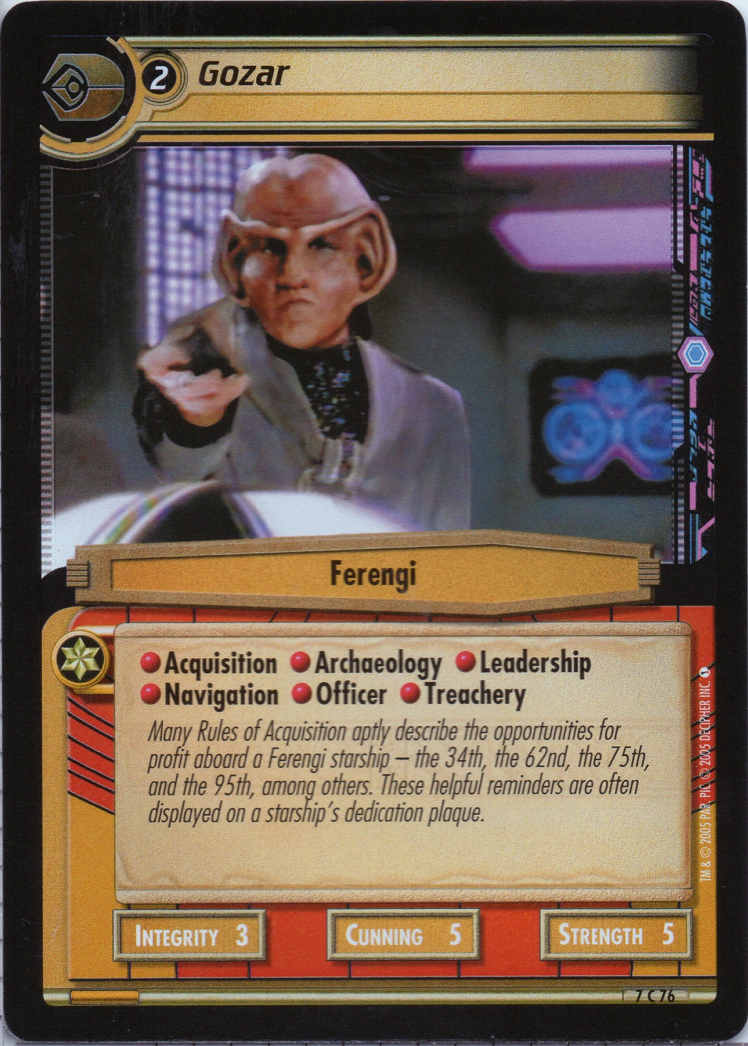 | Lore | Many Rules of Acquisition aptly describe the opportunities for profit aboard a Ferengi starship – the 34th, the 62nd, the 75th, and the 95th, among others. These helpful reminders are often displayed on a starship's dedication plaque. |