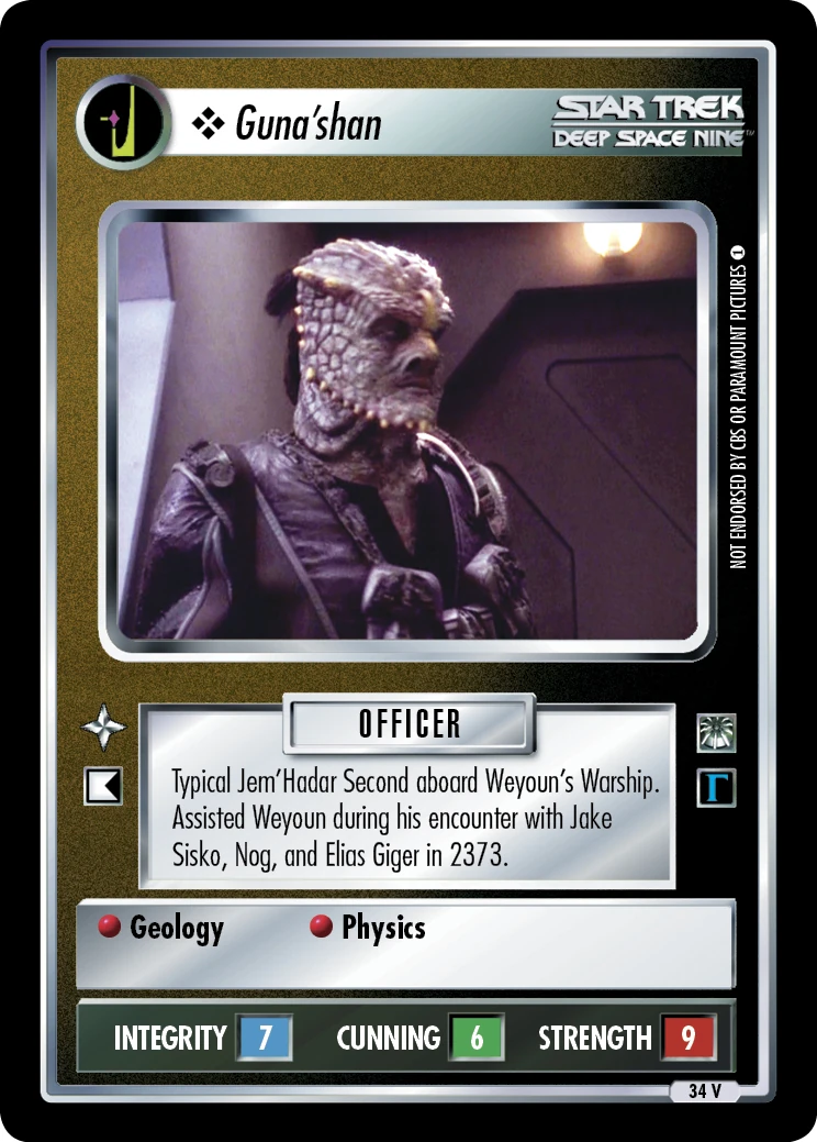 | Lore | Typical Jem'Hadar Second aboard Weyoun's Warship. Assisted Weyoun during his encounter with Jake Sisko, Nog, and Elias Giger in 2373. |