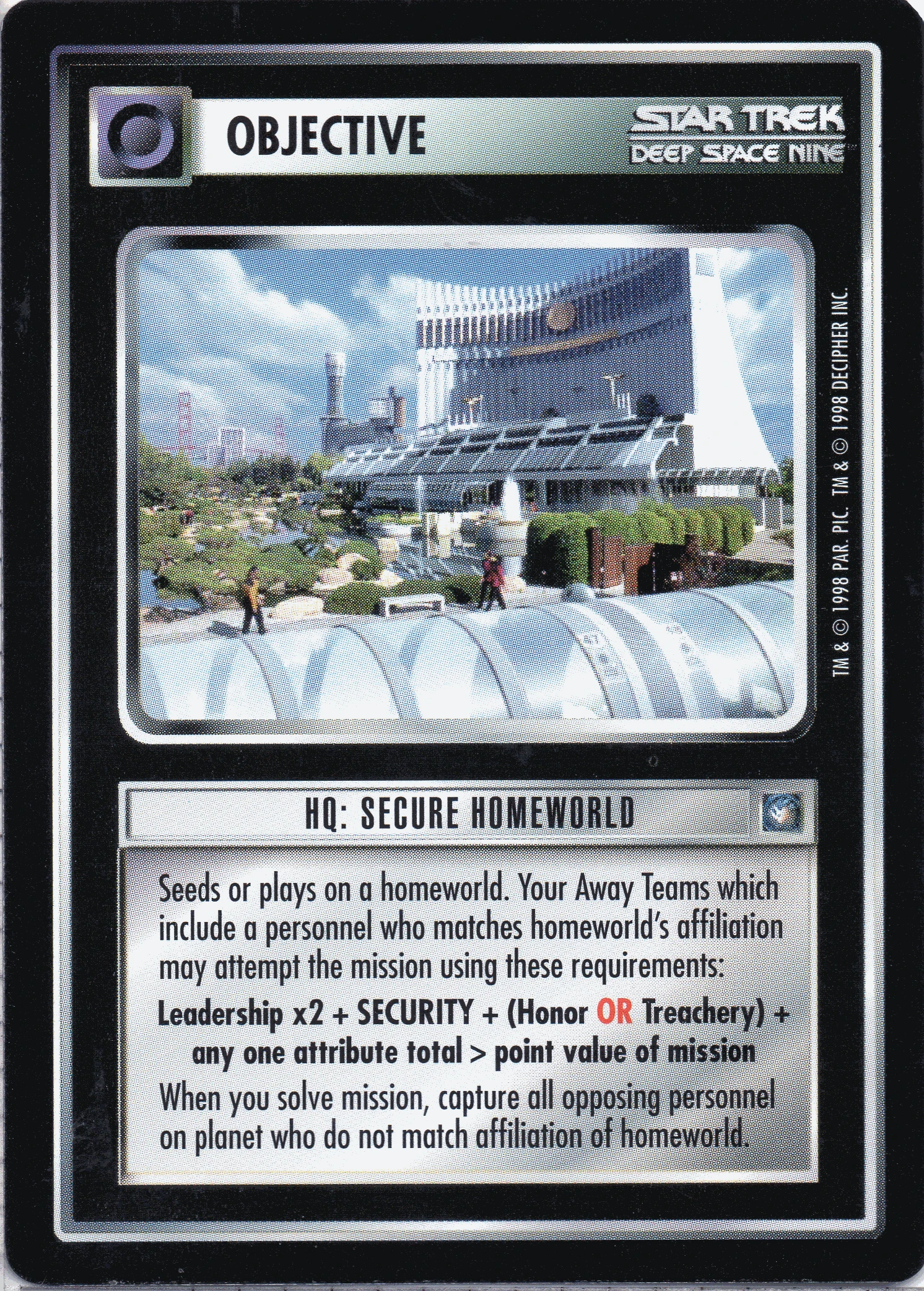 | Game Text | Seeds or plays on a homeworld. Your Away Teams which include a personnel who matches homeworld's affiliation may attempt the mission using these requirements: Leadership x2 + SECURITY + (Honor OR Treachery) + any one attribute total > point value of mission |
