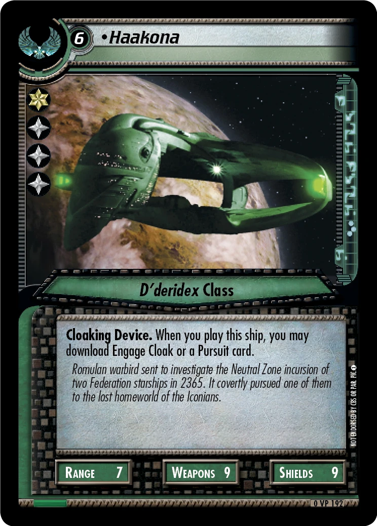 | Game Text | Cloaking Device. When you play this ship, you may download Engage Cloak or a Pursuit card. |