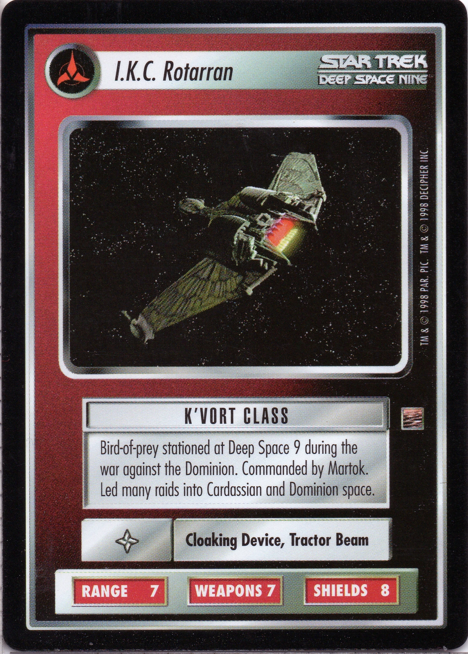 | Lore | Bird-of-Prey station at Deep Space 9 during the war against the Dominion. Commanded by Martok. Led many raids into Cardassian and Dominion space. |